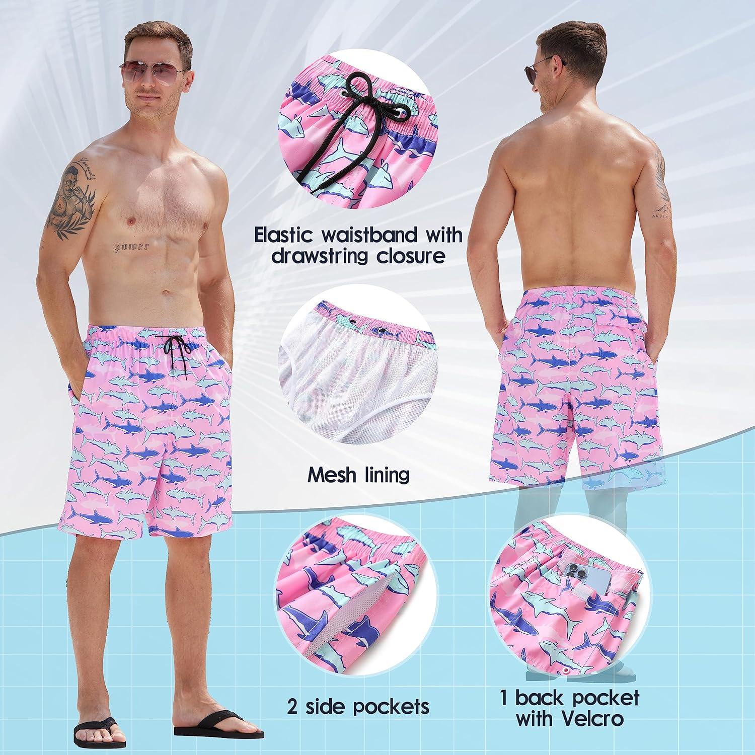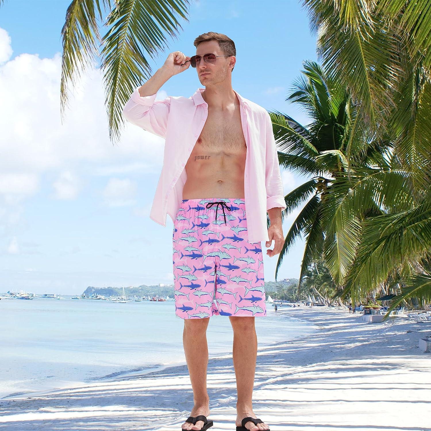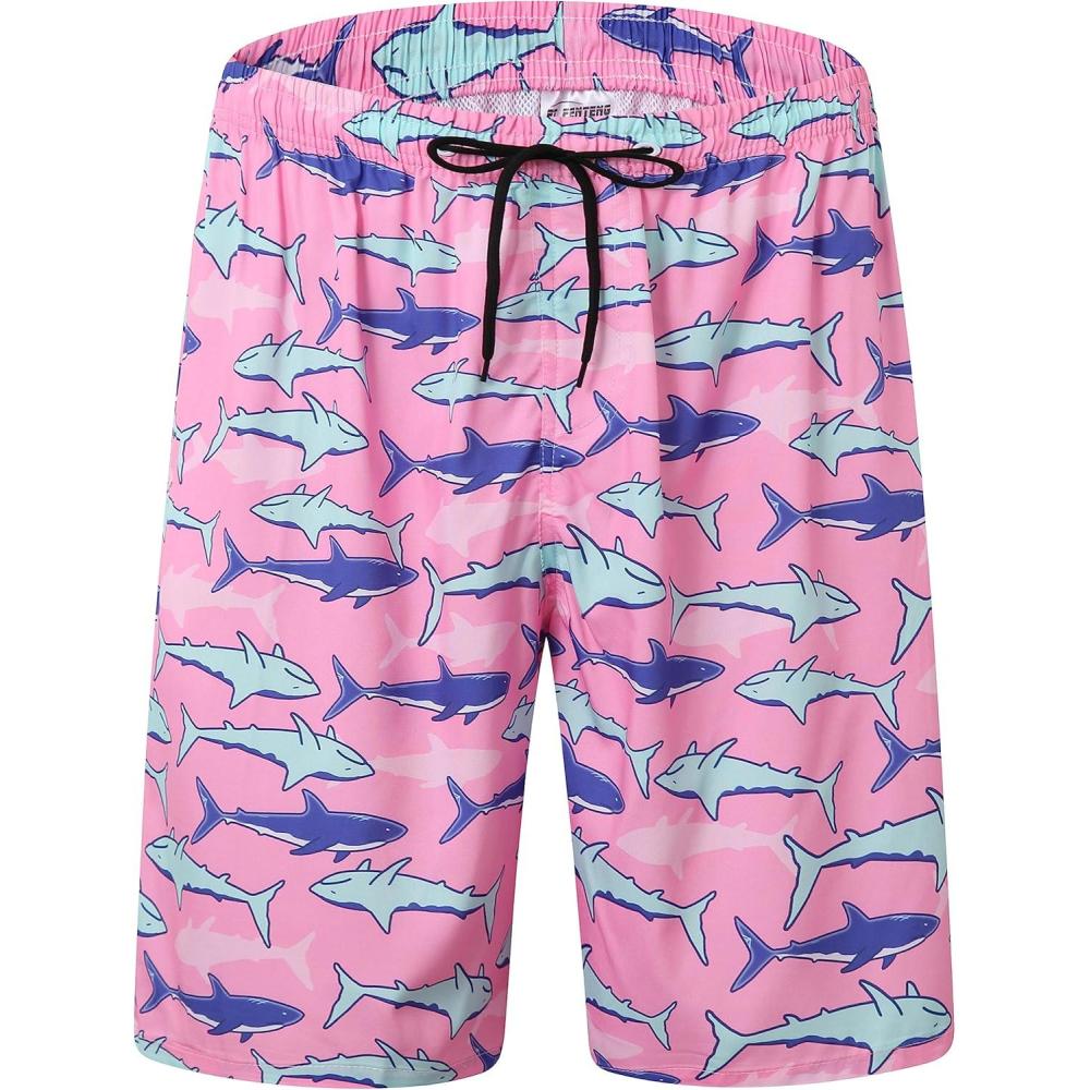 FT FENTENG Mens Swim Trunks Quick Dry Board Shorts with Mesh Lining, Breathable Surf Beach Shorts Swimwear Bathing Suits(Pink Shark-6)