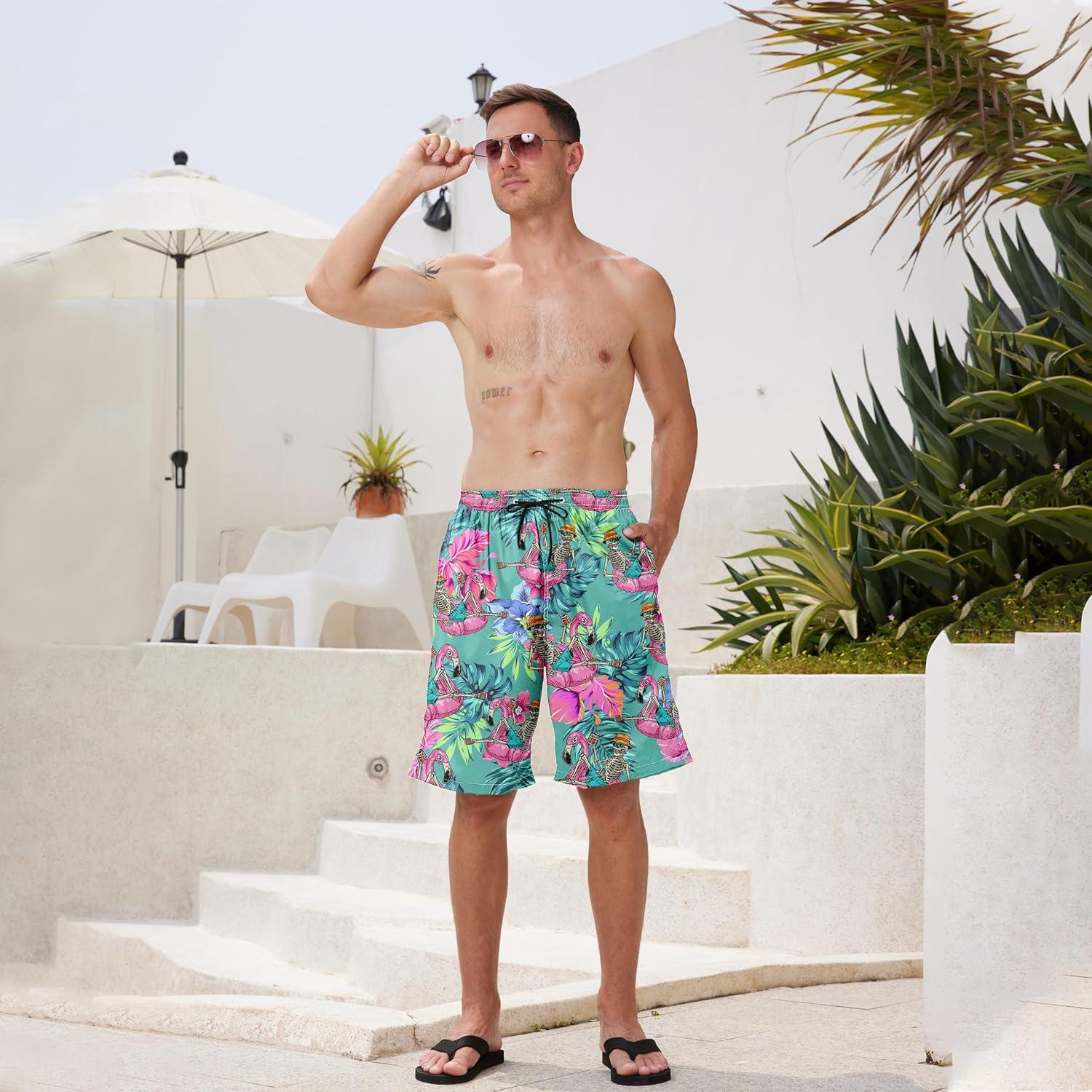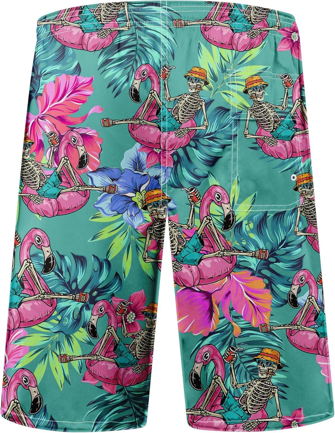 FT FENTENG Mens Swim Trunks Quick Dry Board Shorts with Mesh Lining, Breathable Surf Beach Shorts Swimwear Bathing Suits(Skeleton Flamingo)