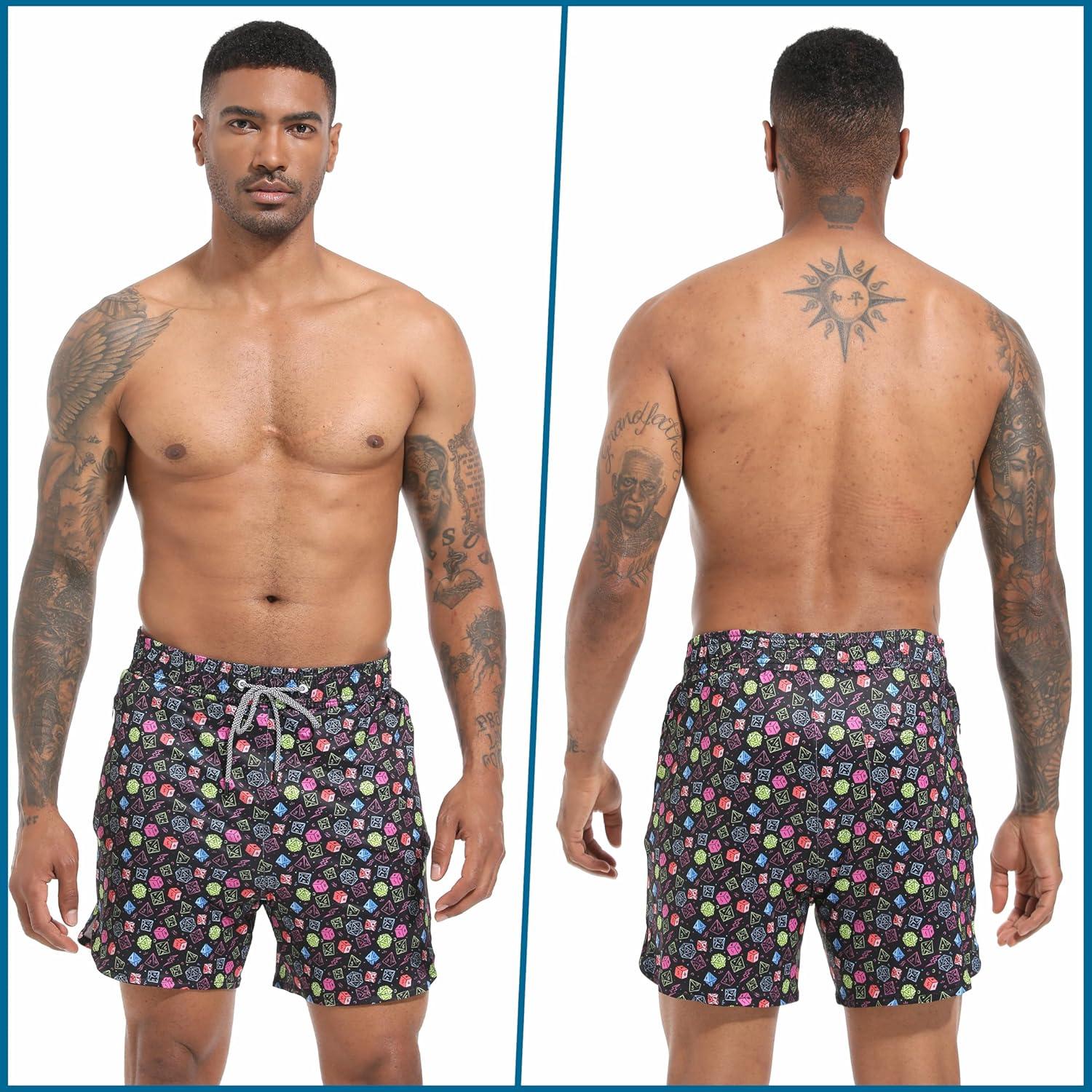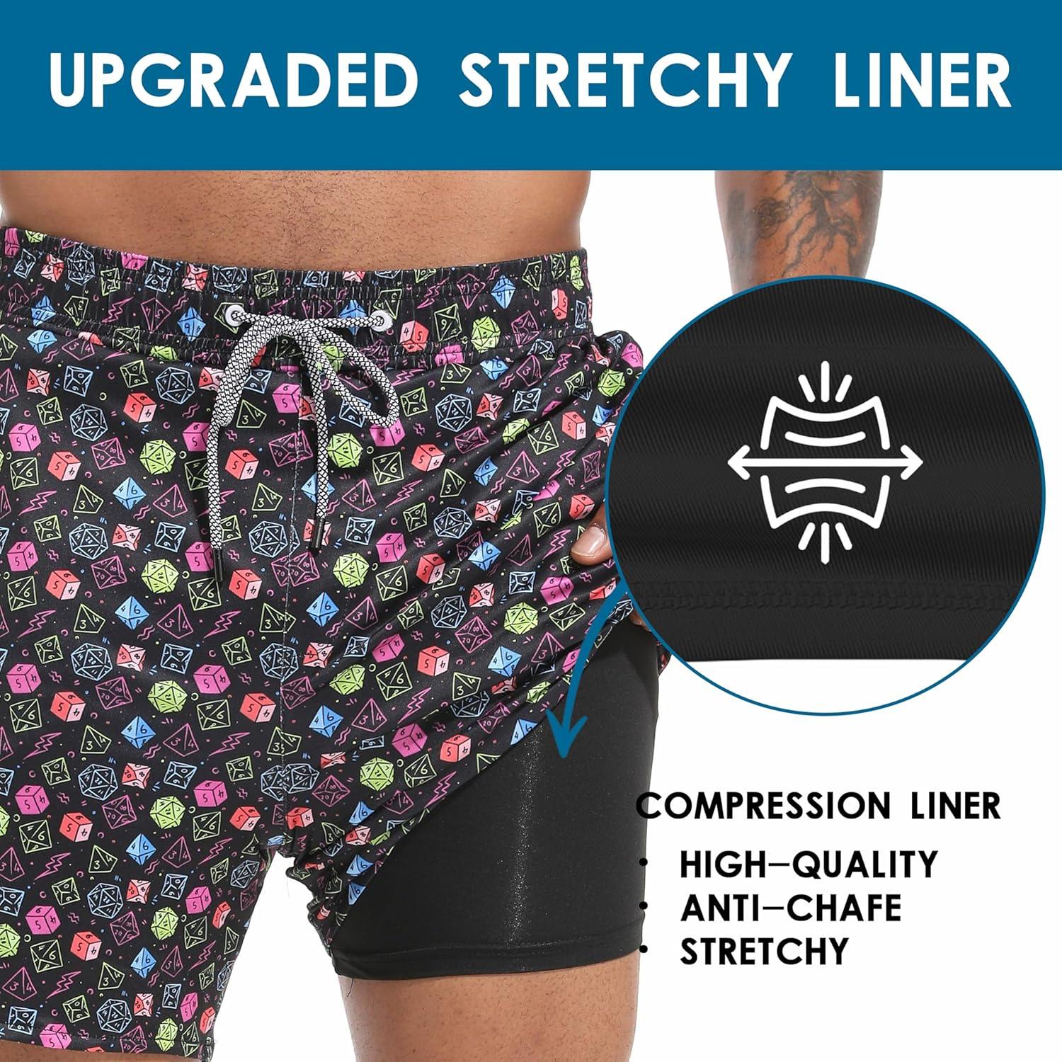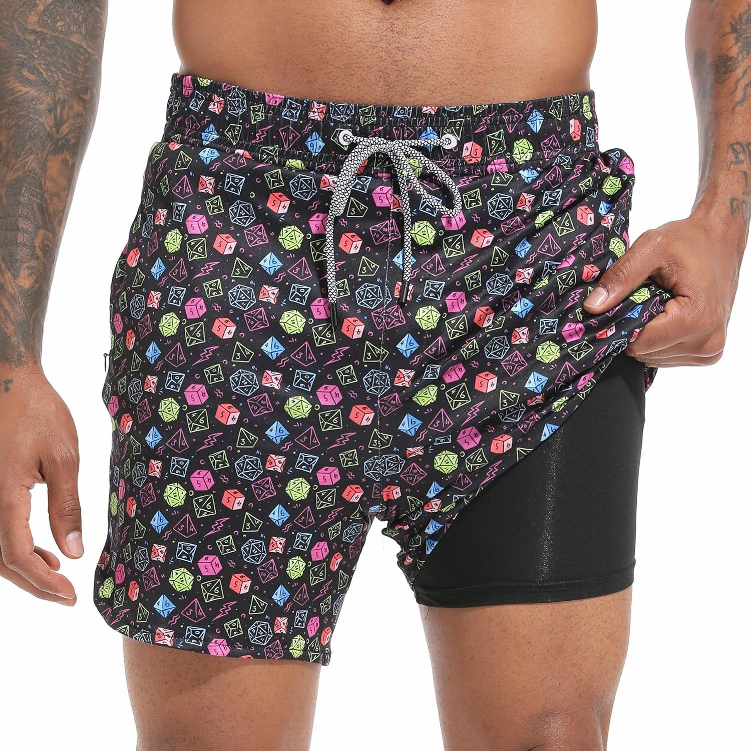 FT FENTENG Mens Swim Trunks with Compression Liner 5.5" Board Shorts with Zipper Pockets 2 in 1 Quick Dry Bathing Suits(Bordeaux Game Dice-c)