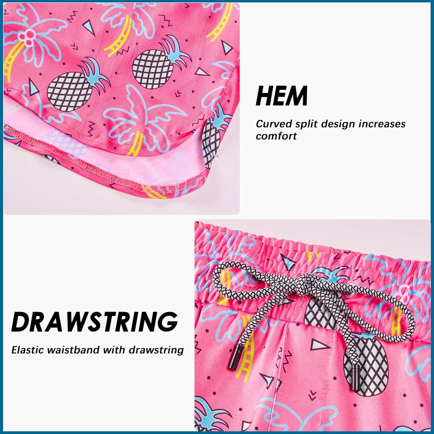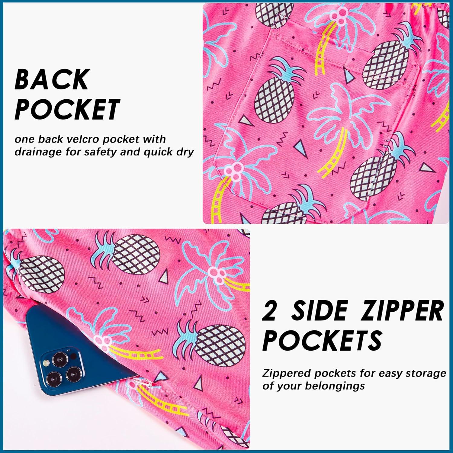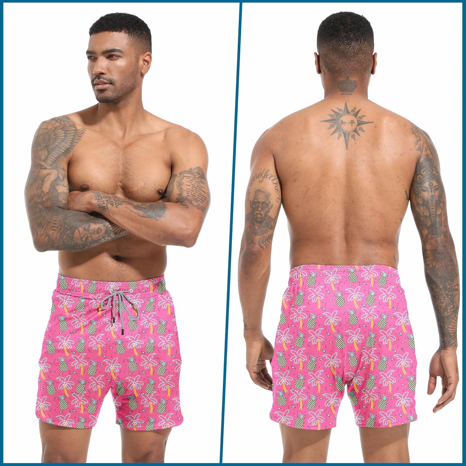 FT FENTENG Mens Swim Trunks with Compression Liner 5.5″ Board Shorts with Zipper Pockets 2 in 1 Quick Dry Bathing Suits(Pink Flamingo)