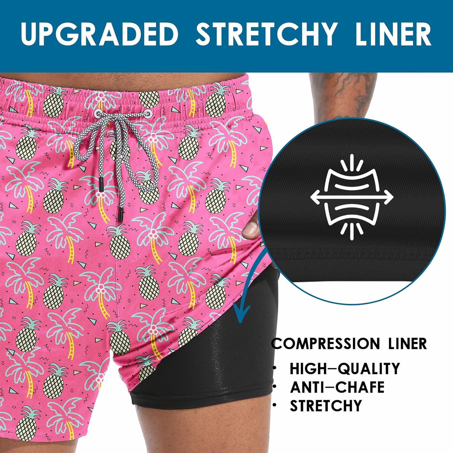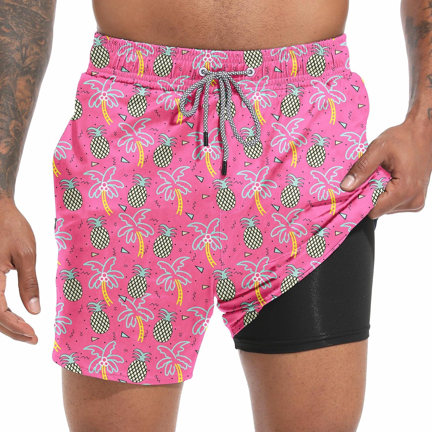 FT FENTENG Mens Swim Trunks with Compression Liner 5.5" Board Shorts with Zipper Pockets 2 in 1 Quick Dry Bathing Suits(Pinapple Palm)
