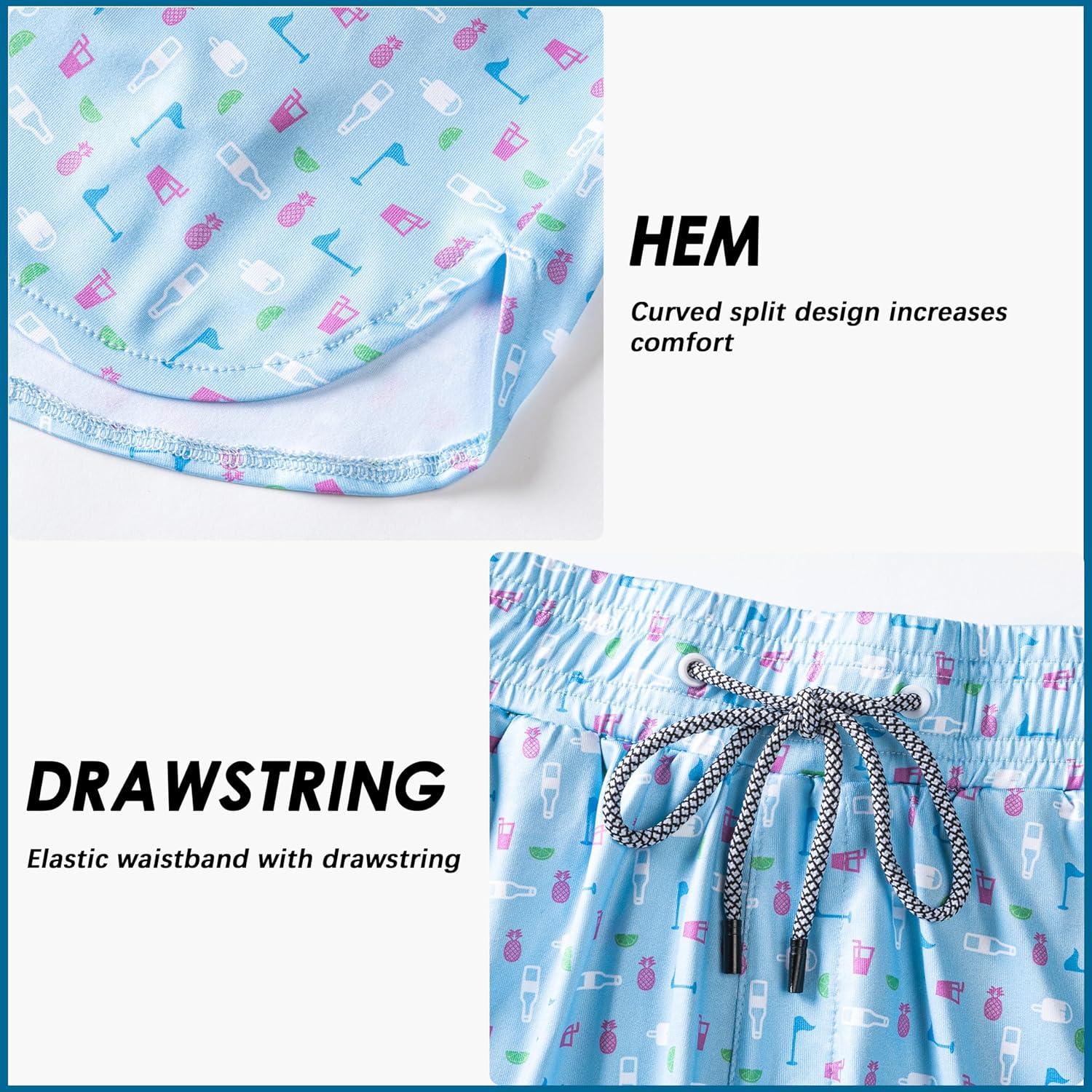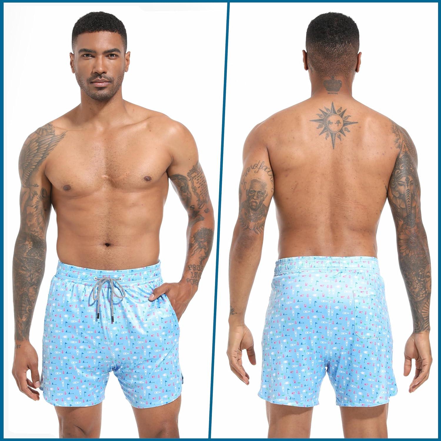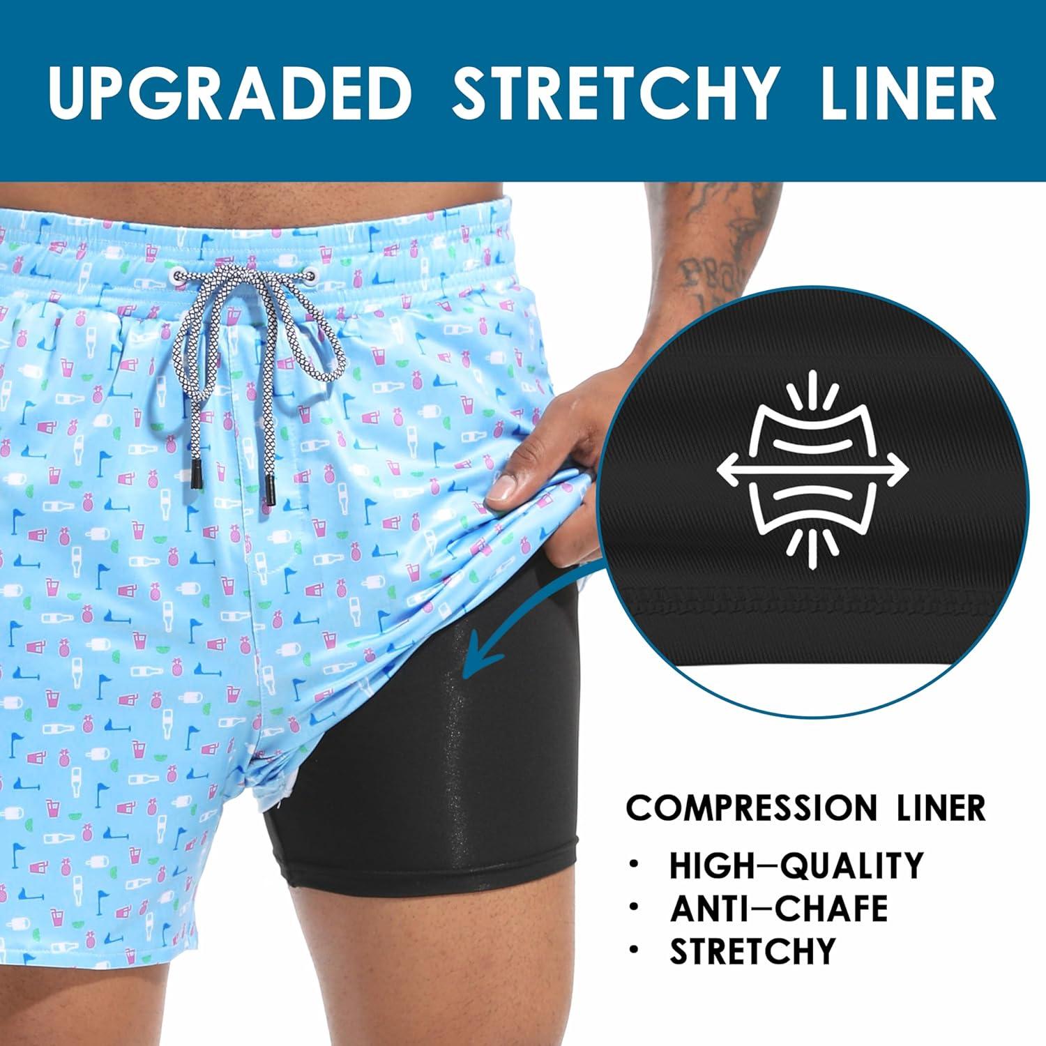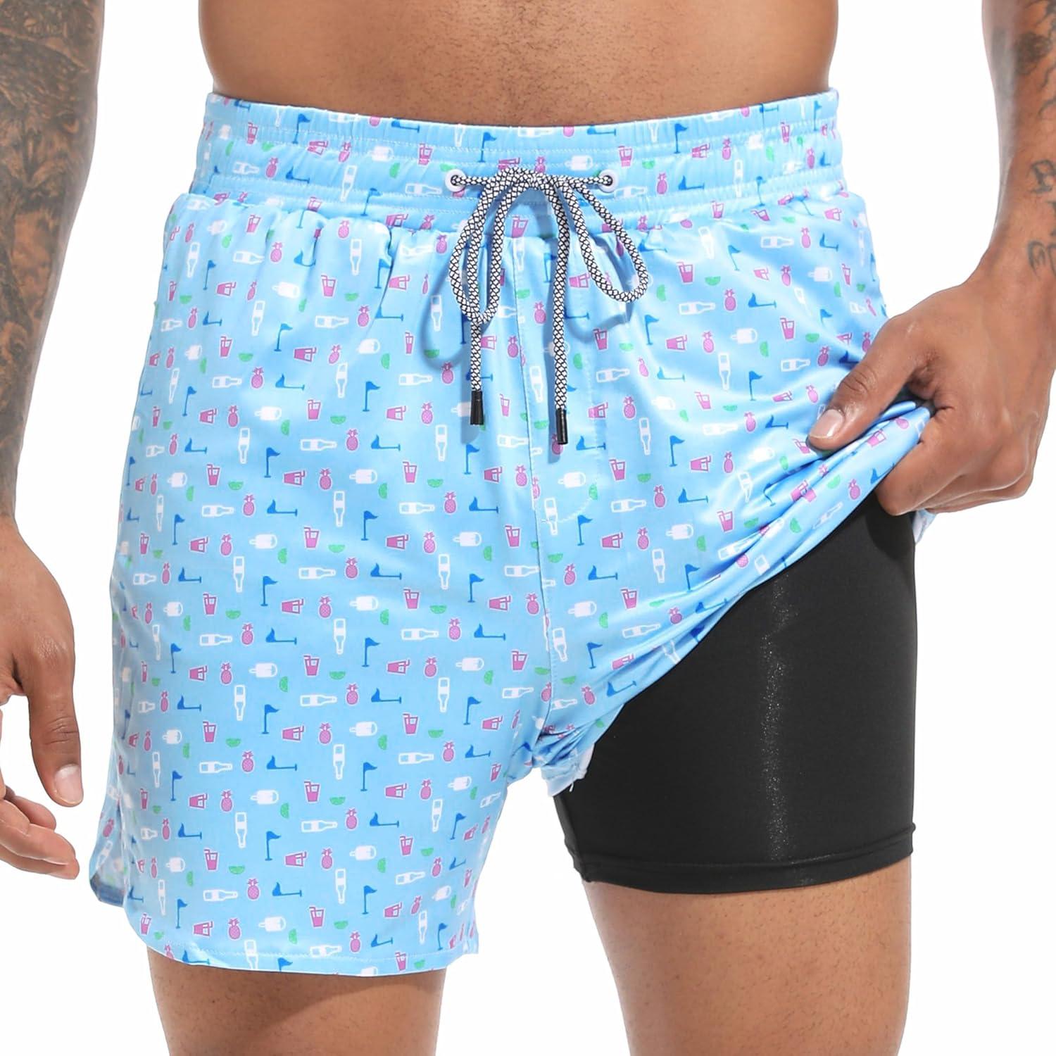FT FENTENG Mens Swim Trunks with Compression Liner 5.5" Board Shorts with Zipper Pockets 2 in 1 Quick Dry Bathing Suits(Sky Blue Beer-c)