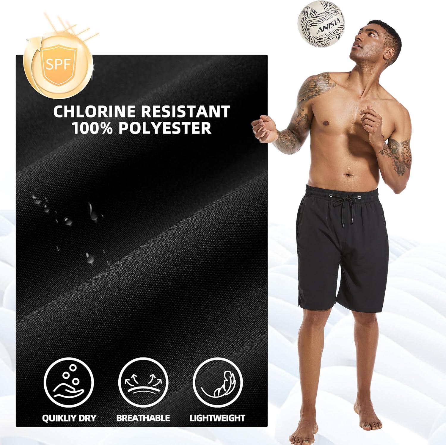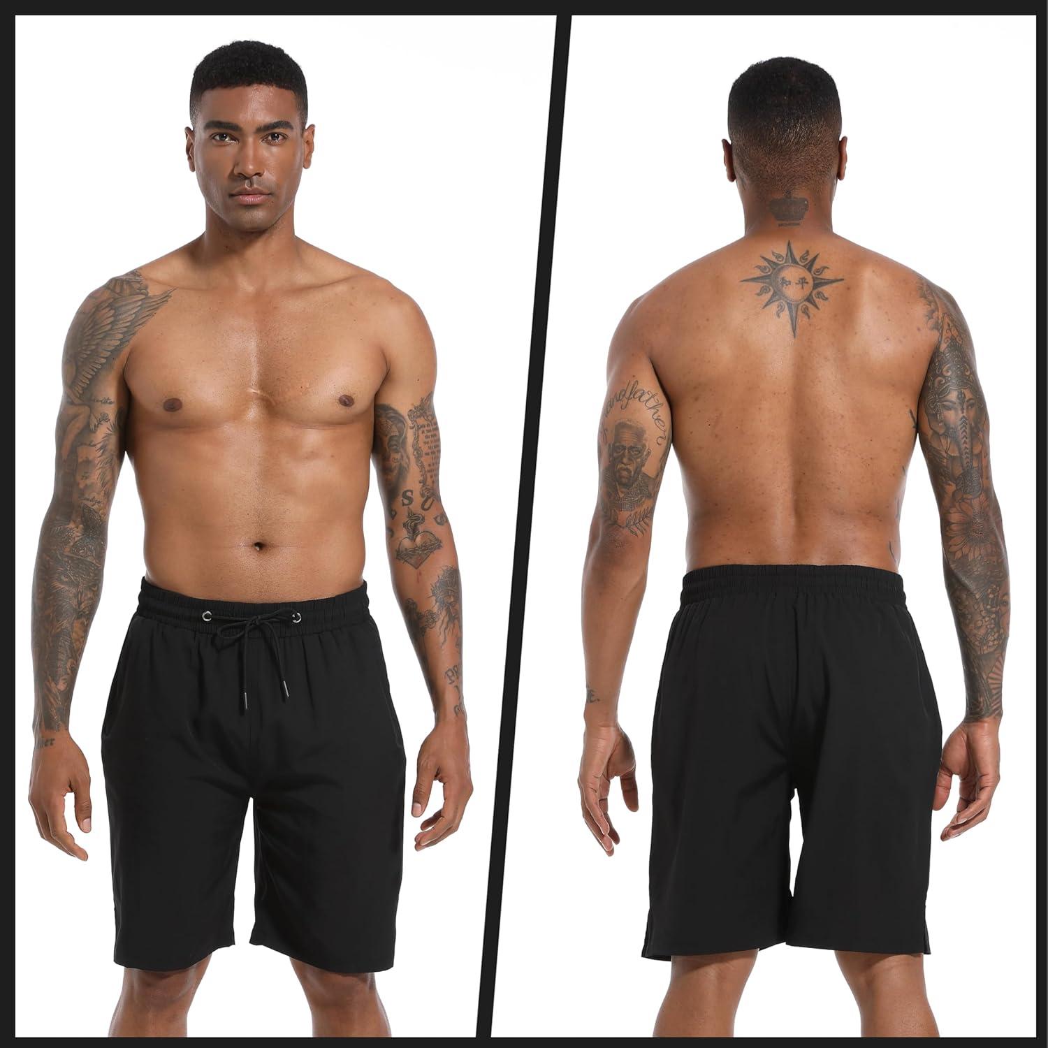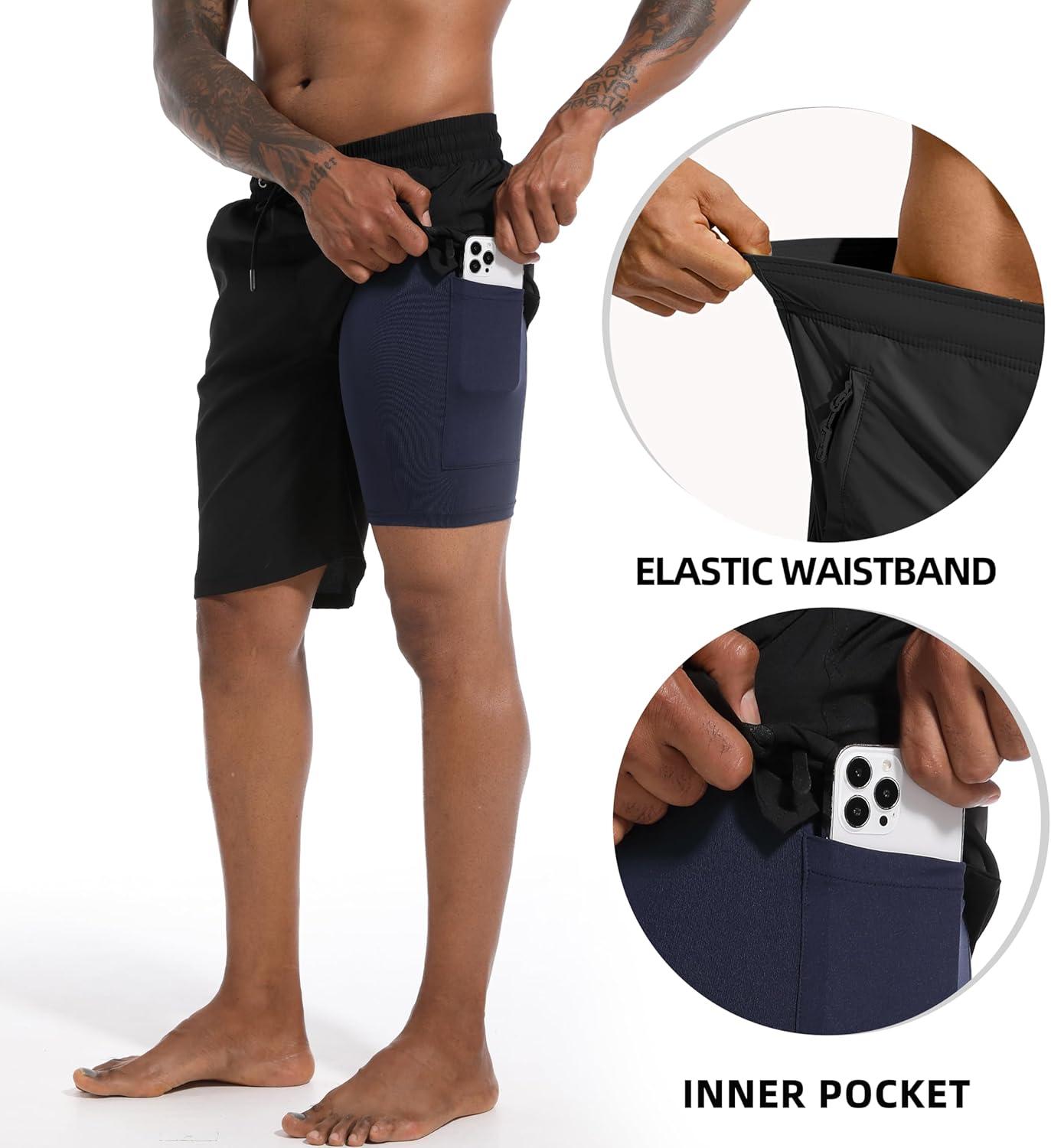 FT FENTENG Mens Swim Trunks with Compression Liner 9″ Board Shorts 2 in 1 Quick Dry Bathing Suits with Zipper Pockets(Black-c)