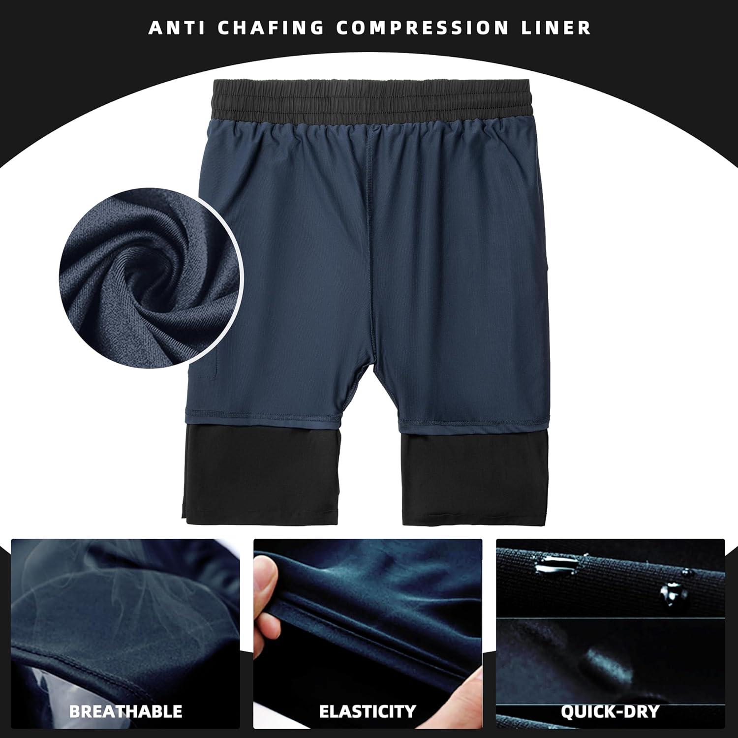 FT FENTENG Mens Swim Trunks with Compression Liner 9″ Board Shorts 2 in 1 Quick Dry Bathing Suits with Zipper Pockets(Blue-c)