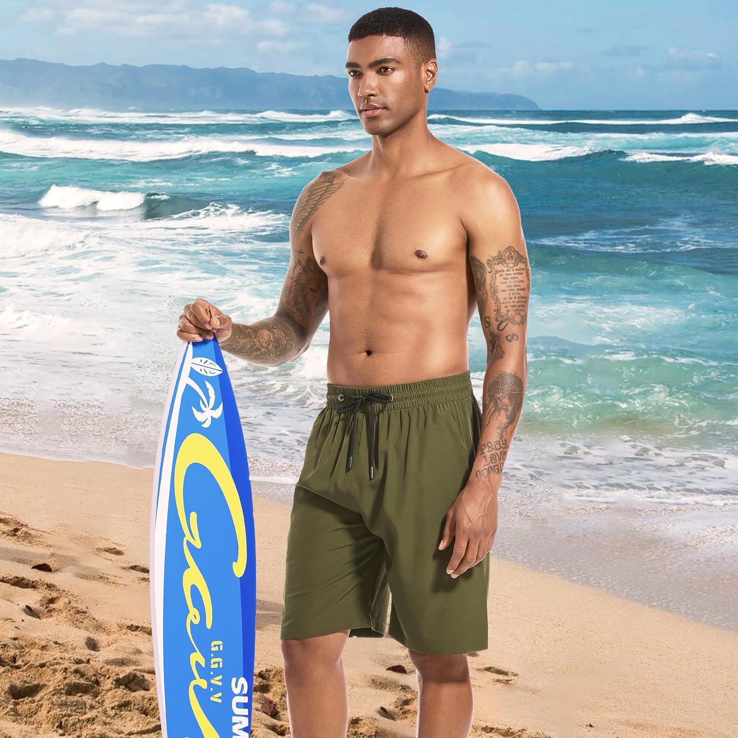 FT FENTENG Mens Swim Trunks with Compression Liner 9" Board Shorts 2 in 1 Quick Dry Bathing Suits with Zipper Pockets(Olive-c)