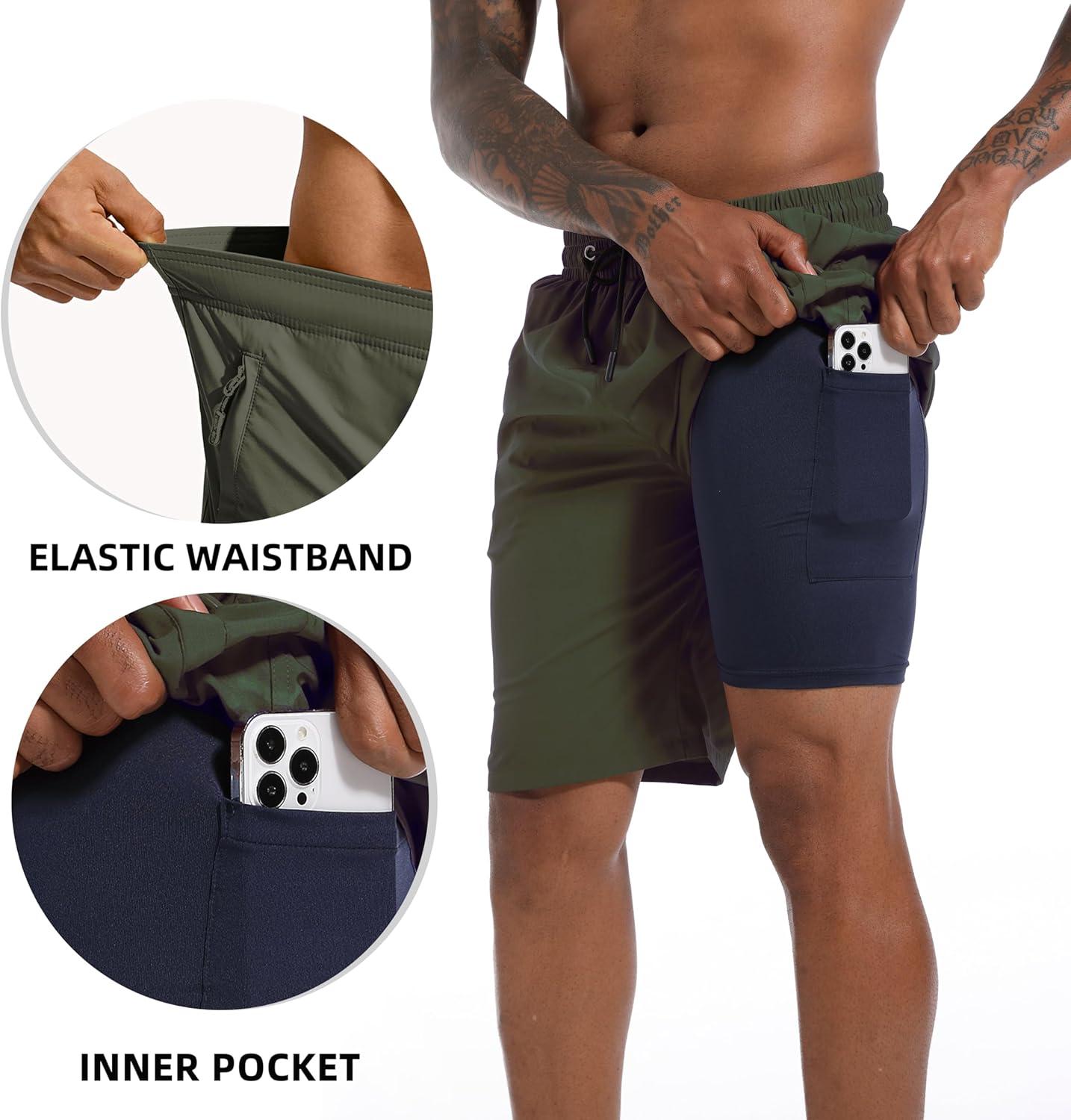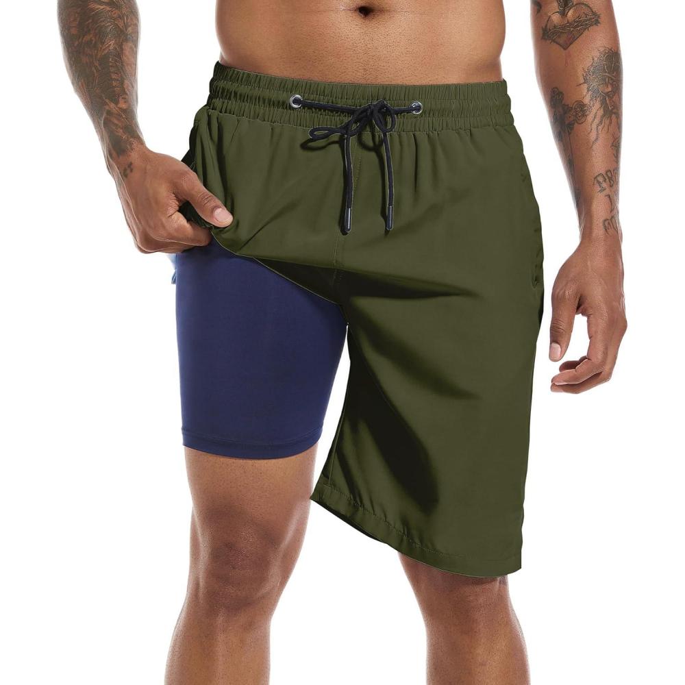 imageFT FENTENG Mens Swim Trunks with Compression Liner 9quot Board Shorts 2 in 1 Quick Dry Bathing Suits with Zipper PocketsOlivec