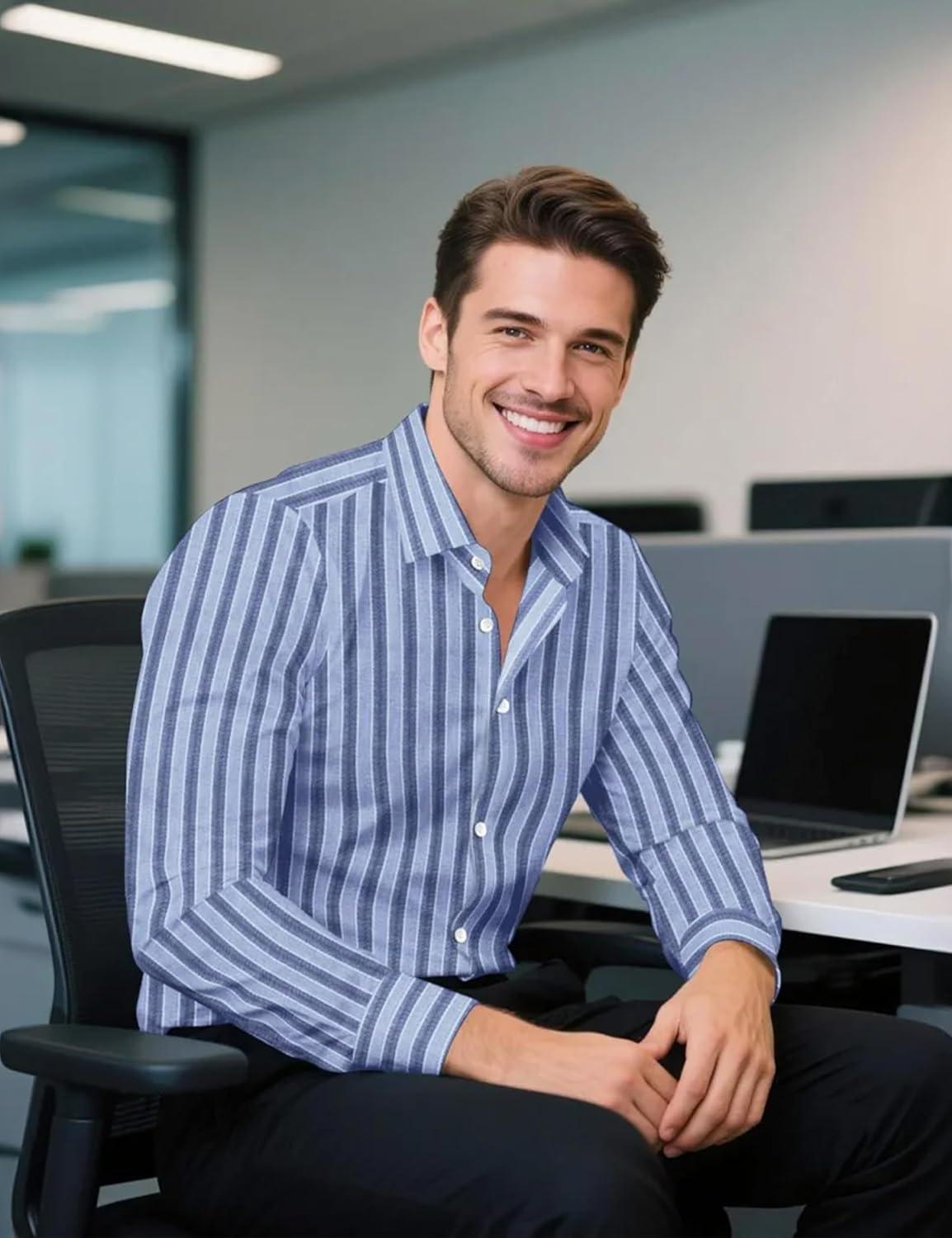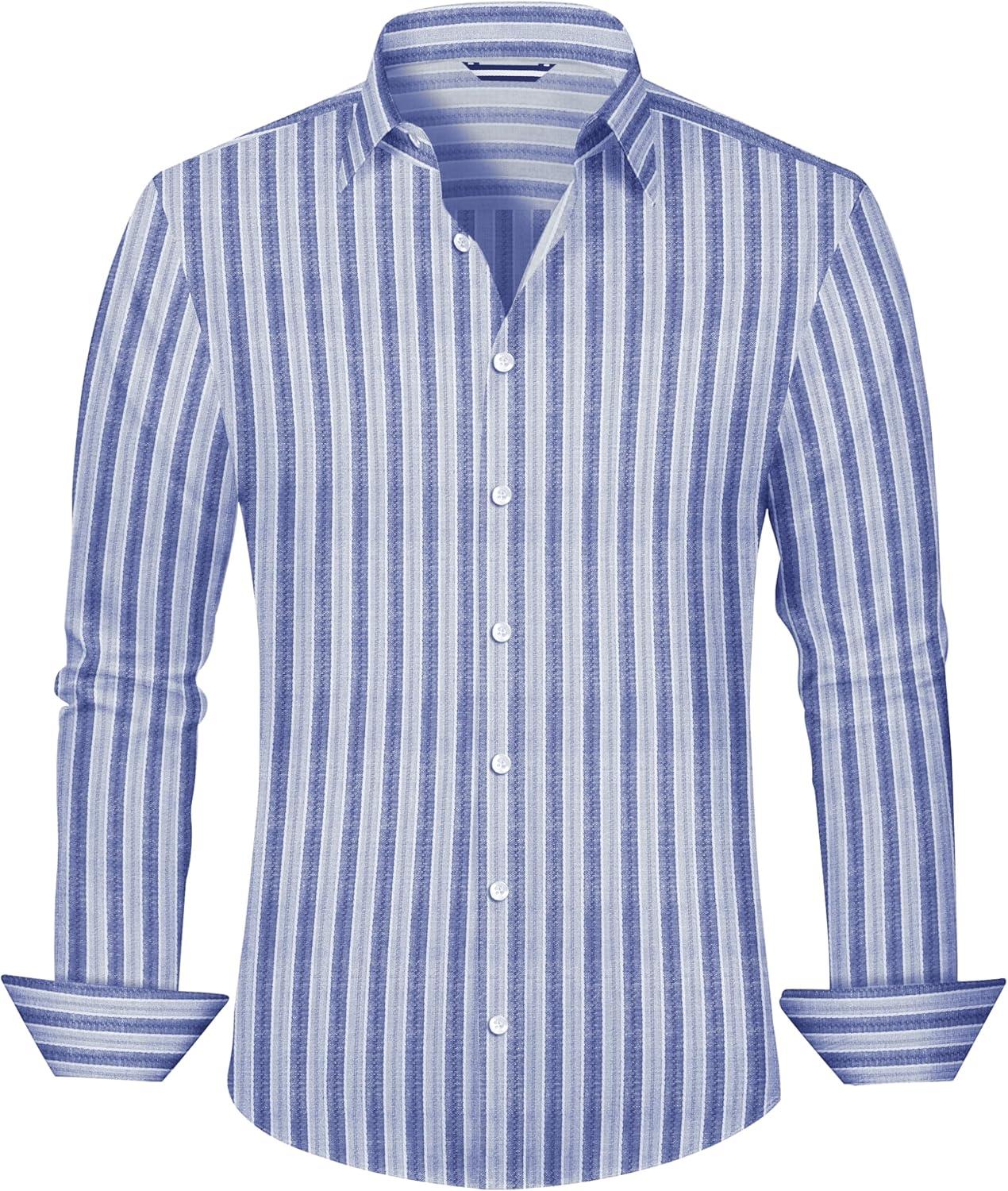 Lzzidou Men’s Striped Button Down Shirt Cotton Blend Long Sleeve Collared Dress Shirts for Business Work Office Casual Date(Blue)