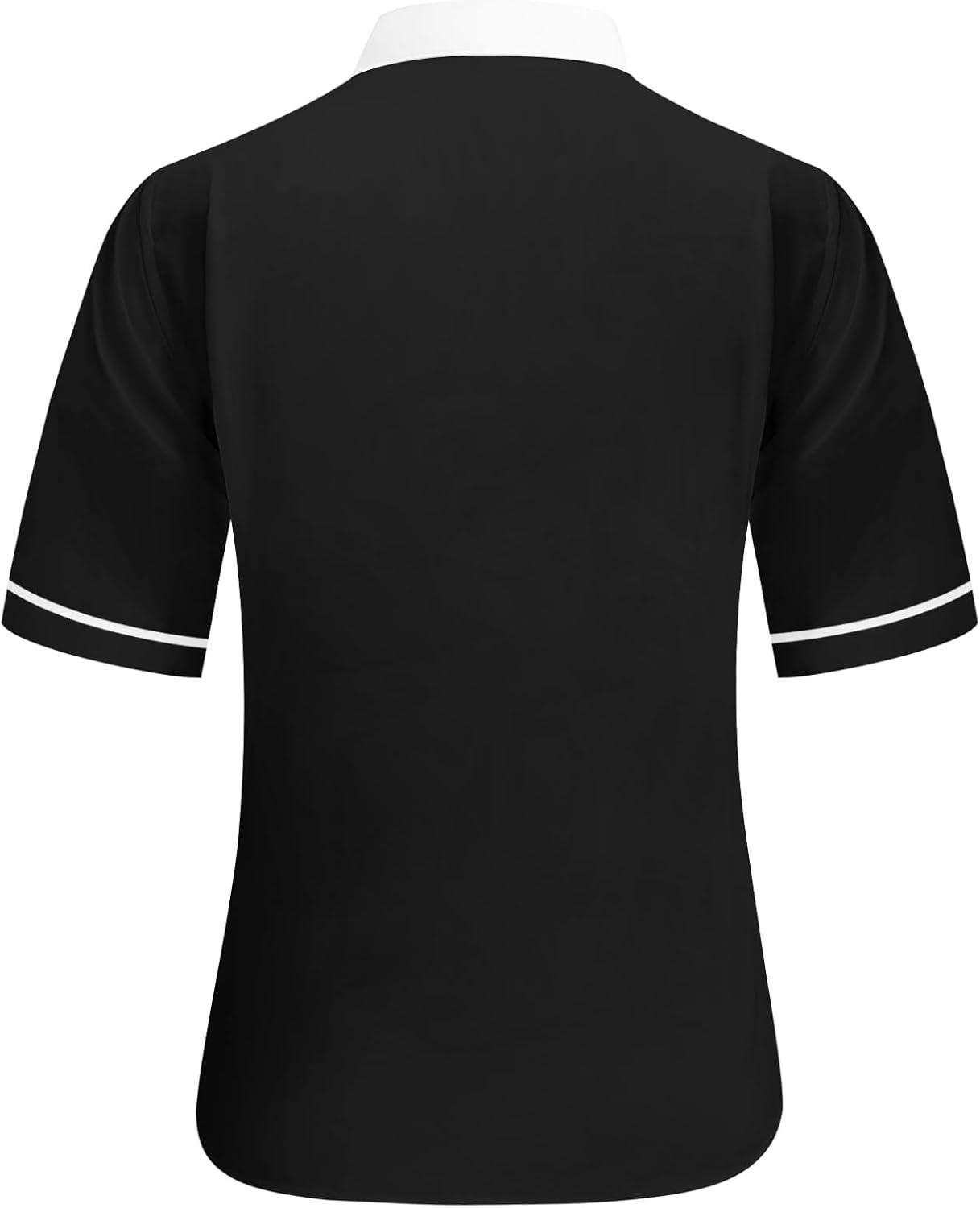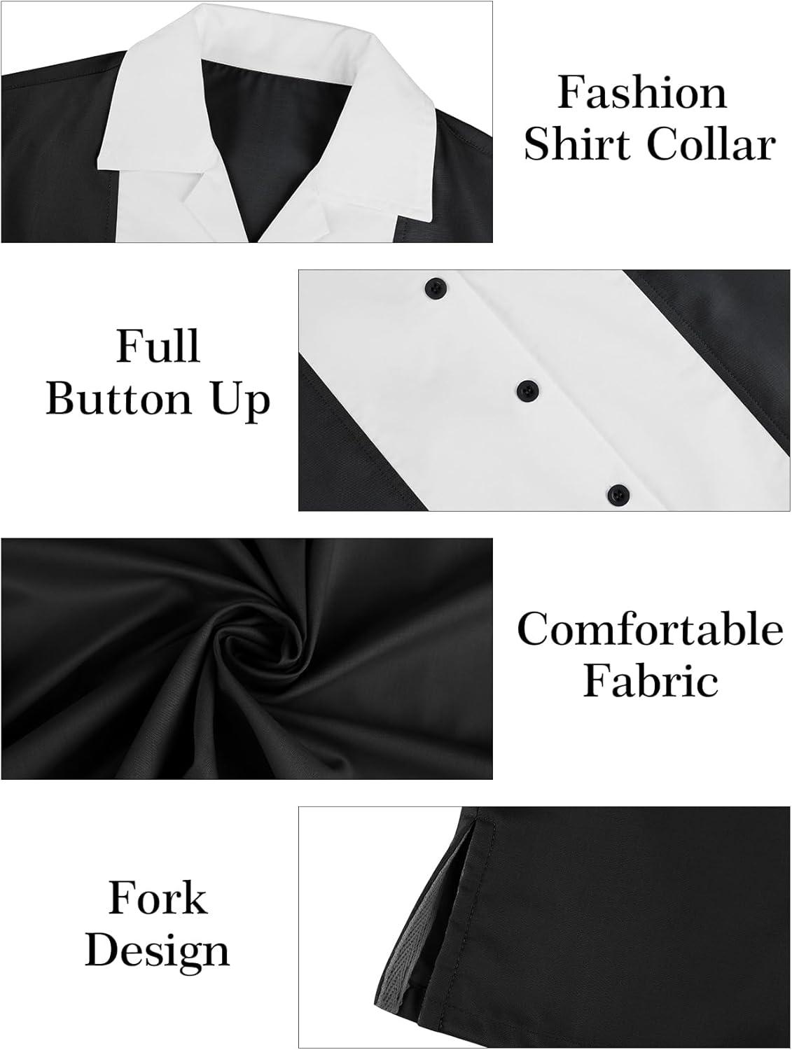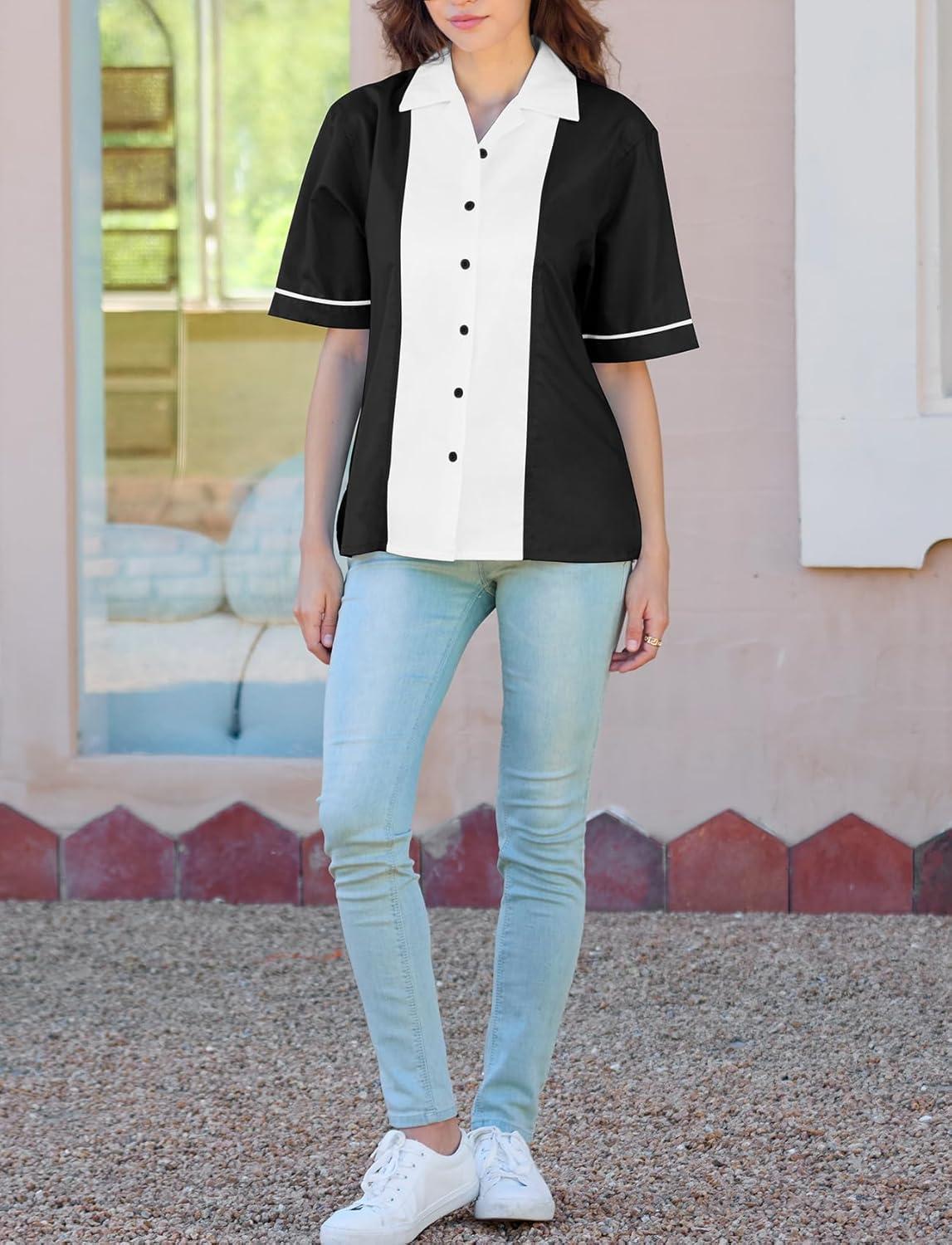Women’s Vintage Bowling Shirts 1950s Short Sleeve Button Up 50s Retro Outfits Sock Hop Costume(Black White)