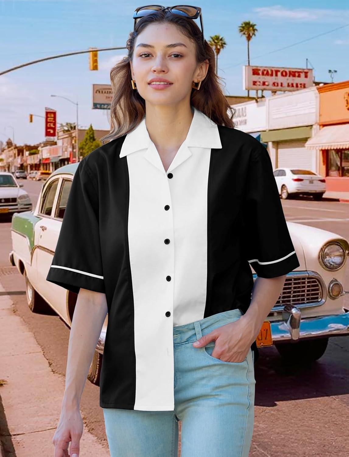 Women's Vintage Bowling Shirts 1950s Short Sleeve Button Up 50s Retro Outfits Sock Hop Costume(Black White)